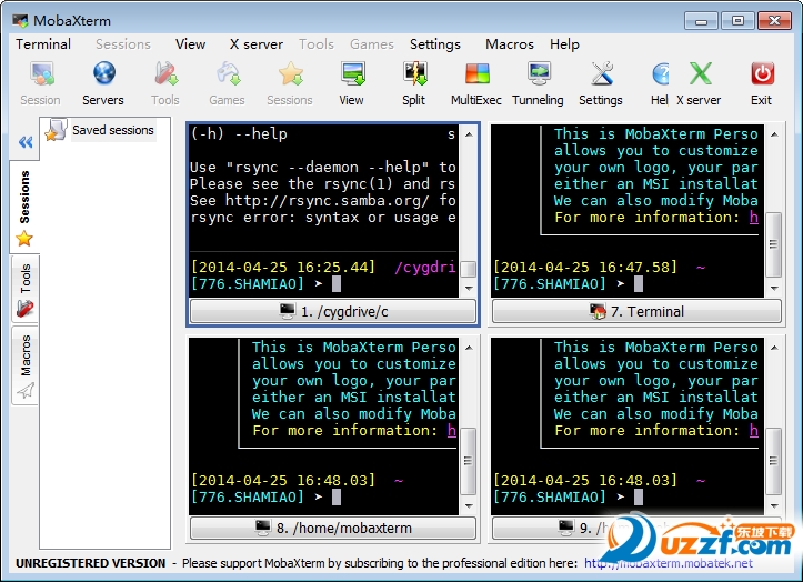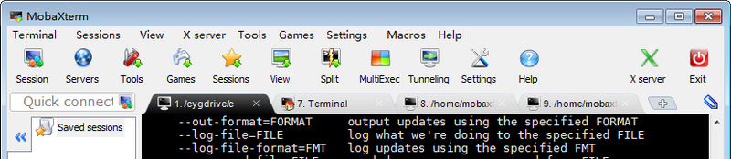 MobaXterm内置多标签页、横向纵向2分屏和田字形4分屏,用于一个窗口内管理多个连接。管理多台服务器不必开多个窗口。