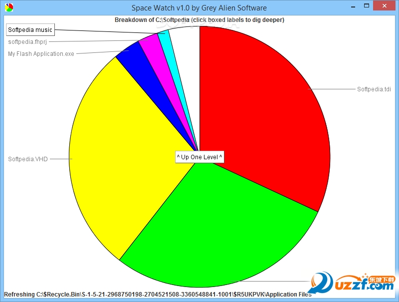 应用程序允许您查看被占领的空间在您的驱动器和显示数据的百分比。你可以深入并确定的文件和文件夹占用的空间最点击所需的箱标签。你可以回到主窗口和探索其他地方或外部驱动器通过访问一个级别按钮。