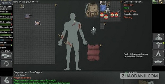 疼痛,感染和流血。任何一种情况,如果不处理的话,最终都可能导致玩家死亡。疼痛,只有靠吃止痛片了,游戏中有两种止痛药物,在探索的过程中随机获得。感染,需要使用盘尼西林,高级医疗器(稀少)。流血,用干净的布条包裹伤口,干净布条的获得方式是火源+器皿+脏布+水。如果选择医疗技能,能够直接看到三种状态的具体情况,并且在游戏一开始,获得一个急救箱。急救箱里会有止痛片,盘尼西林和干净的布