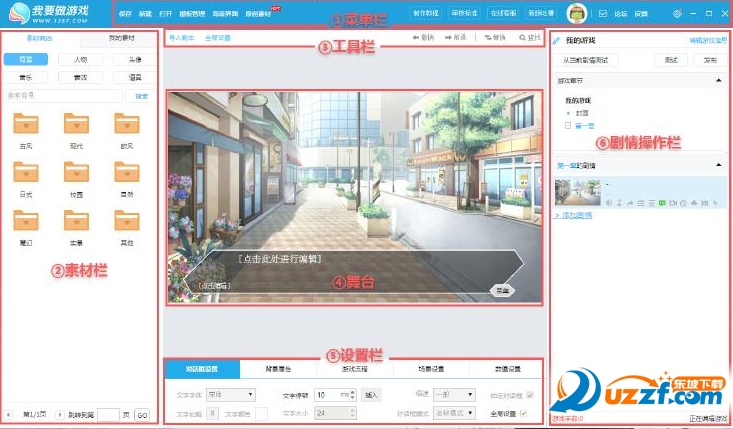 包括:对话框设置、背景/图片属性、游戏流程、场景设置、数值设置