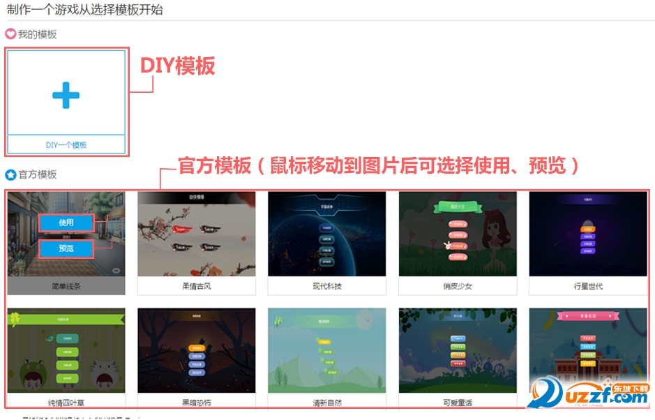 - 模板管理:包括【我的模板】、【官方模板】。游戏制作过程中如果对自己初始设置的游戏模板不太满意,