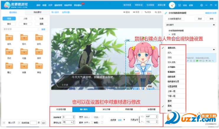 图片属性:选中立绘或者道具图片素材的时候切换至图片属性。图片的角度、比例、显示效果、位置.