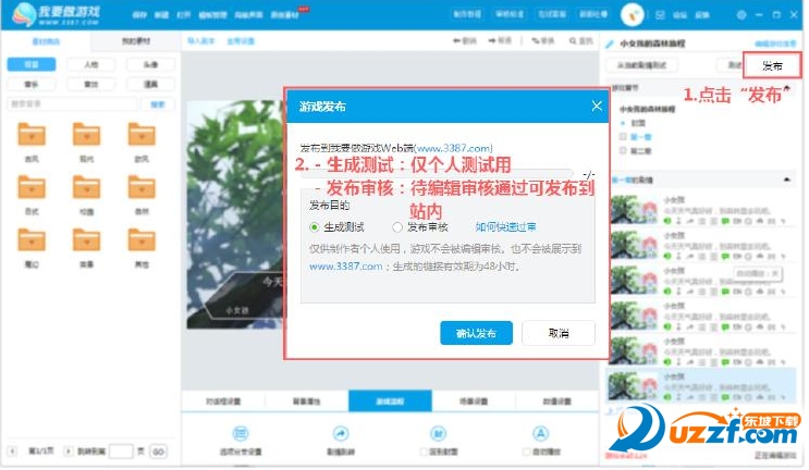 发布的操作步骤:点击“发布”- 选择“生成测试”或“发布审核”- 单击“确定”