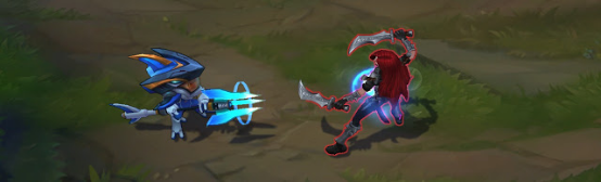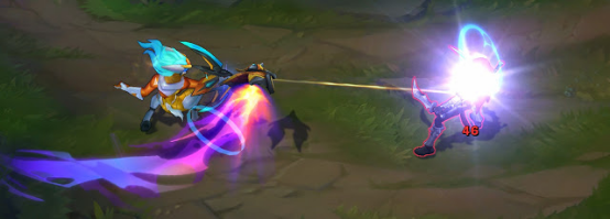 上一次对于金克丝Q技能的改动,是为了让两种形态的差距拉大,从而形成鲜明的对比。我们希望机枪形态是主力输出形态,但是攻击距离会比较短,而炮形态应该用来进行Poke或者是团战的范围输出。目前看来该改动的效果比较理想,在这种情况下我们决定稍微增强一下炮形态的攻速:现在炮形态拥有更快的基础攻速,但受装备加成的数值再次被下调了——不过总体来说除非你出6把幻影之舞,否则新版本的炮形态都会提供更快的攻击速度。