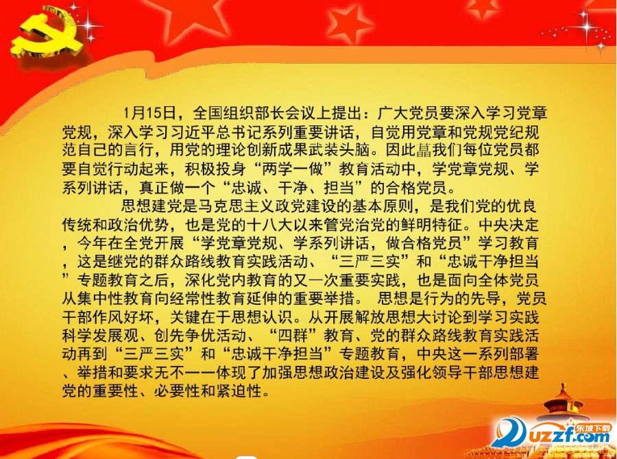 全国上下都是在流行两学一做的,你想有更加详细以及有规划的去做这个,你就需要最新的两学一做ppt课件模板,当然现在网络上面大部分都是徐提要收费才可以免费下载的,现在就可以试试本站为你带来的免费2016两学一做ppt课件模板!