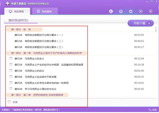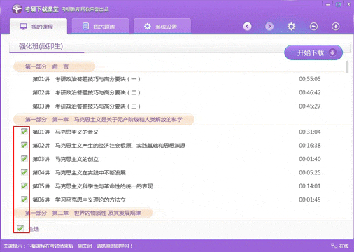 在复选框中勾选需要下载的章节,点击“开始下载”按钮: