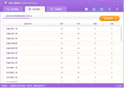 3、“我的题库”是与学员所报课程相对应的题库信息,需要注意的是,