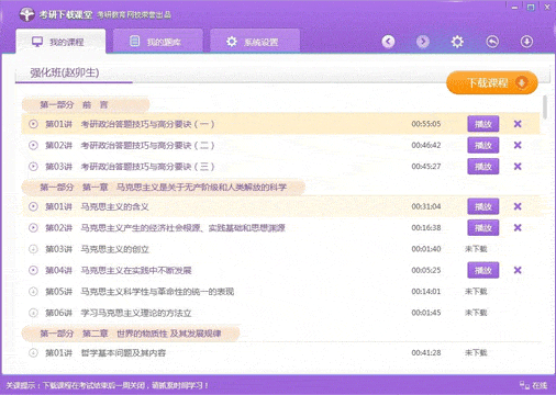 考研下载课堂是考研教育网官方推出的离线课程下载软件,功能强大使用简单,能免费下载课程资料,像视频、ppt等都能免费下载,是下载考研课程资料的必备工具!