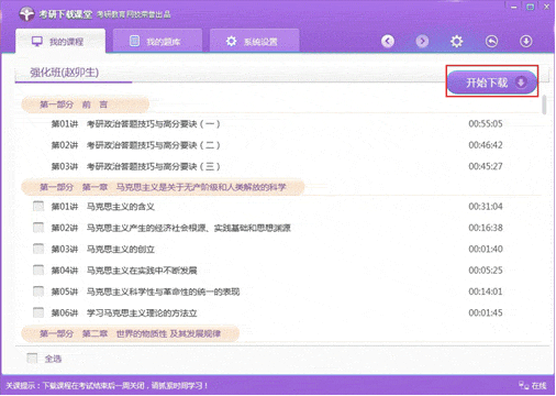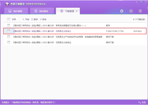 考研下载课堂是考研教育网离线课程的官方下载软件,考研教育网学员下载购买的课程资料,包括教学视频、教学PPT等,支持断点续下,为学员离线学习提供了便利。