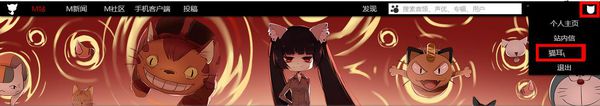 登陆M站,鼠标移到右上角的白猫头,然后点击【猫耳】,如图