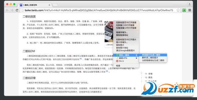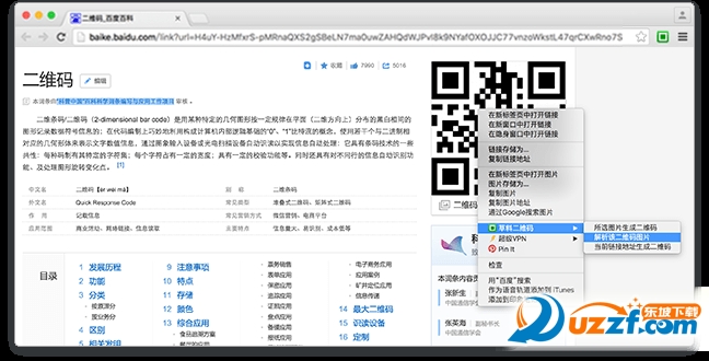解析网页上任意一个二维码图案的内容 经常会在页面上碰到一些想要扫描的二维码,但是一时找不到手机,或者手机正在遥远的地方充电。这时候就可以在二维码上点击鼠标右键,选择“解析二维码图案”,就可以直接看到二维码指向的网址或者是内容。