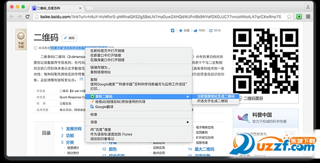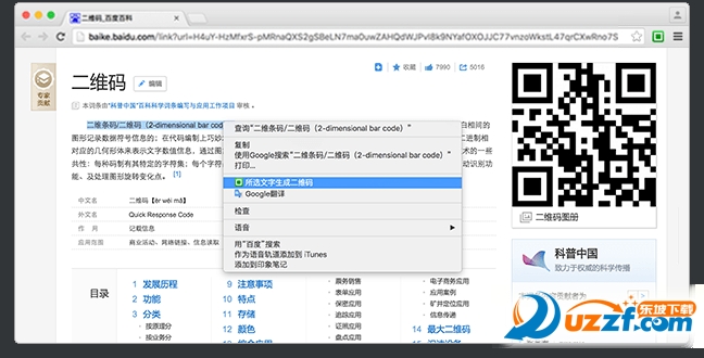 将页面上任意一段文字生成二维码 有时候看到页面上一段精彩的文字,想要快速保存到手机或是分享给朋友的时候,可以用鼠标复选这段文字,然后点击鼠标右键,选择“所选文字生成二维码”,马上可以将这段文字生成二维码.