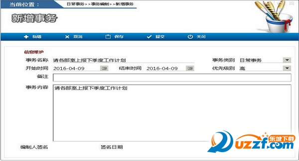 3 日常事务:对下属或同级部门下达需要完成的任务;执行上级部门或领导下达的需要完成的工作;跟踪本人下达的任务执行情况。