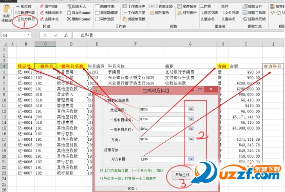 点击【对方科目】-在弹出窗口中选择四个关键字段“凭证号”“一级科目编码”“一级科目名称”“方向”,然后选择生成对方科目的存放位置,注意,一定要存放在第一笔凭证的起始行的某一列,如图示。