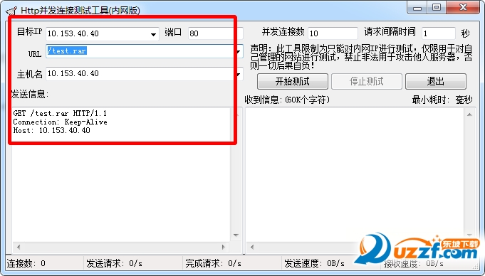 由于该软件为内网http连接数测试工具,不会对公网网络IP构成威胁,同时软件仅限于内网IP测试,禁止一切非法用途!