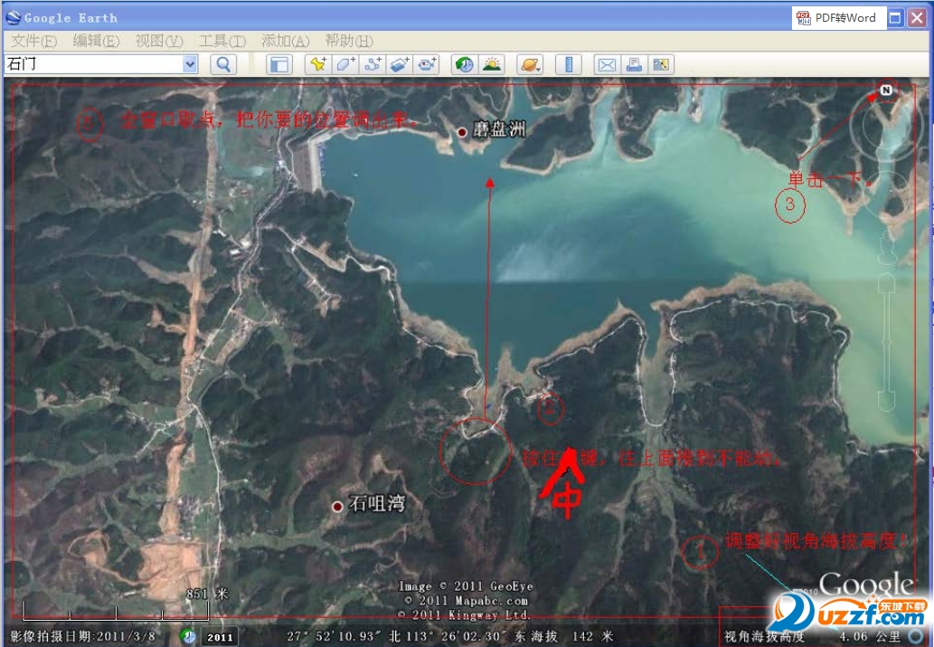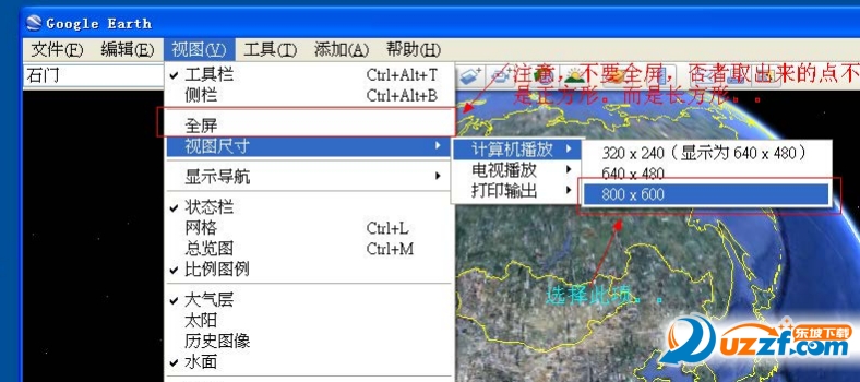 打开谷歌地球,注意不要全屏,否则取出来的点不是正方形,而是长方形。全窗口取点,把你要的位置调出来。调整好视角海拔高度。按住中键上推,目的:俯视角度=90度。