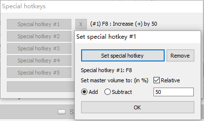 第三部分的「Special hotkeys」可以让你设置多个不同的快捷键,这些快捷键可以帮你快速提高或者降低指定百分比的音量,设置好以后还是十分好用的。