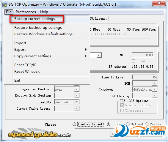 由于涉及到系统修改,所以需要使用管理员权限来运行 SG TCP Optimizer。而且谨慎起见,在首次运行后,建议大家点击左上角的「File – Backup current settings」来对当前系统默认设置进行保存。
