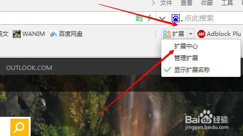 这里我们需要用到360浏览器,我们点击拓展旁边的小三角,然后点击选择拓展中心