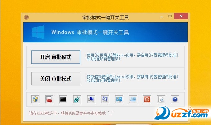 Windows审批模式一键开关工具支持一键开启/关闭审批模式。开启审批模式后,电脑应用商店等Metro应用可正常使用,但系统失去超级管理员权限;关闭审批模式后,系统获取超级管理员权限,但电脑应用商店等Metro应用打不开了。可根据实际需要进行切换。为方便系统维护,添加了几个常用的系统命令,点击相应的图标即可直达窗口。