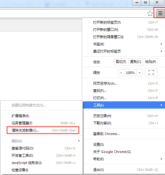 点击浏览器右上角的选项按钮,选择“工具”——“清除浏览数据”