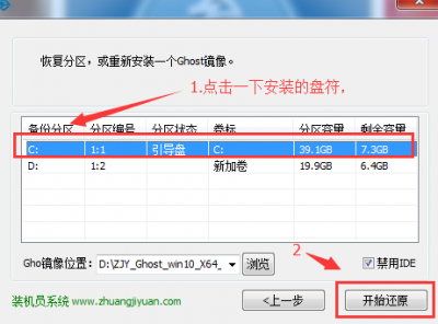 3、选择好安装的盘符(一般选择C盘),然后点击开始还原: