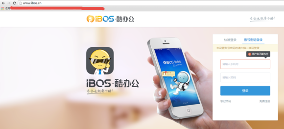 1.首先登陆PC端IBOS的酷办公地址,没有酷办公账号的用户需要先进行注册,酷办公账号目前默认为手机号码
