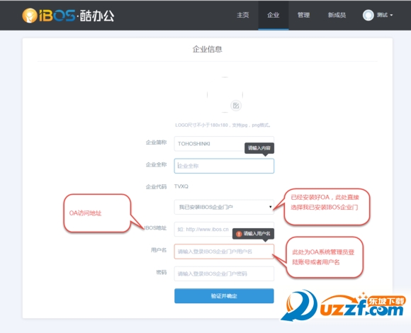 3.创建企业后酷办公会直接跳转至企业信息完善页面,通过这个页面可进行OA和酷办公的关联绑定。