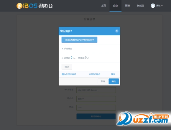 5.绑定OA地址保存后,系统会自动弹出酷办公和OA用户关联页面,如果是两边都有添加用户,并且用户名相同,那么系统会自动匹配相同用户名用户,如果部分用户没有自动匹配,管理员可点击“手动绑定”来实现绑定功能。酷办公绑定OA时,如果酷办公中并没有添加用户,那么可以在“管理”模块中添加了用户之后再关联绑定OA人员。