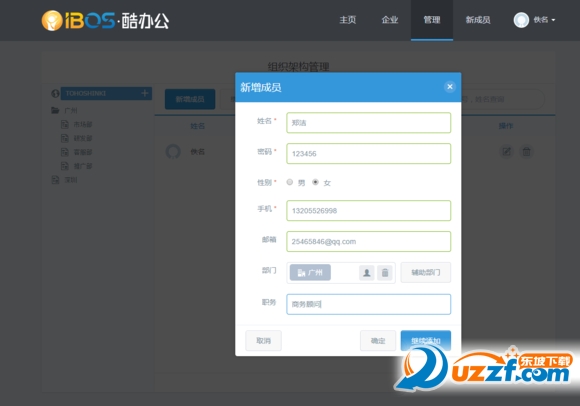 6.由于酷办公和OA系统是两个独立的系统,组织架构和用户不能直接通过OA同步到酷办公中,因此在PC端酷办公管理后台,管理员直接进入“管理”模块就可设置组织架构和添加用户。酷办公用户可管理员手动添加,也可让员工自行到酷办公中注册,然后搜索企业代码进行加入。管理员登陆PC端酷办公管理后台在“新员工”模块去审核就可以了