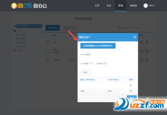 7.组织架构和用户添加完成,此时管理员需要“绑定OA用户”,酷办公中的用户名如果和OA用户名相似的用户,可进行自动匹配,如下图所示;如果存在用户名有差异或者自动匹配失效的情况,可点击“手动绑定”来建立一一对应的绑定关系;两者的用户绑定也可在OA后台的酷办公绑定页面来实现。