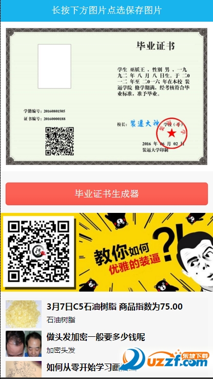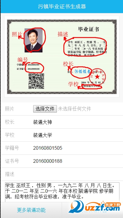 又是一年的毕业季到来了很多的人朋友圈以及QQ空间都是在晒各种各样的毕业证的,那么现在就可以给你介绍下面的这款朋友圈恶搞大学毕业证书生成器,想怎么生成自己需要的毕业证书都是可以的!