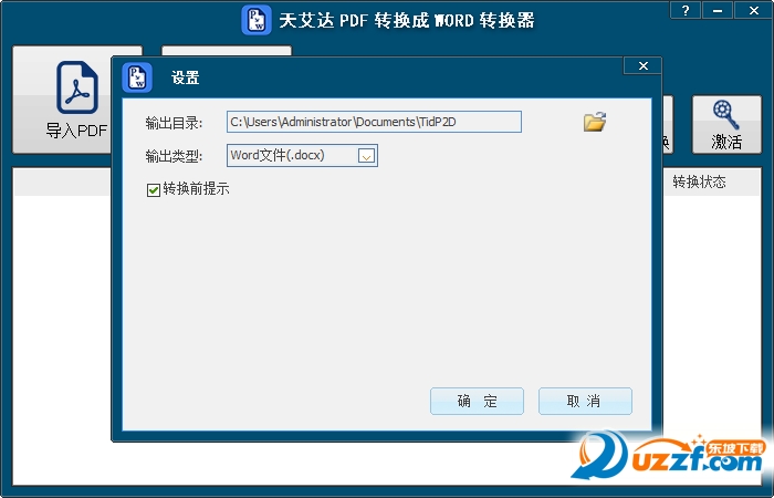 1. 运行天艾达PDF转换成WORD转换器, 点击设置按钮打开设置对话框, 然后在输出类型中选择文本文件(.txt), 并点击确定按钮对所更改的设置进行保存。