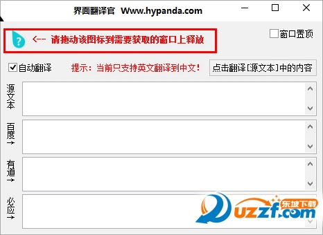 界面翻译官可以帮助用户获取某个软件程序上的源文本,将其翻译成其他文字,支持百度、有道、必应三种翻译工具。注意,目前本工具只支持英文翻译成中文