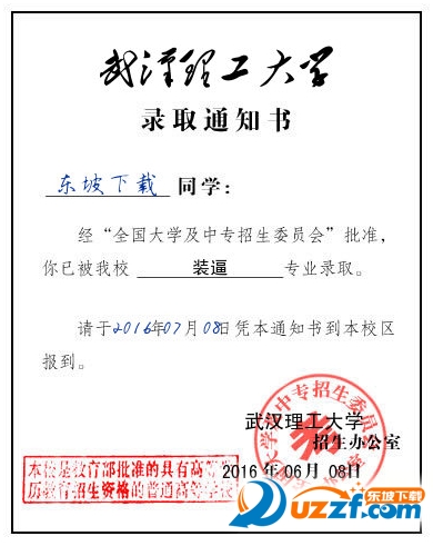 高考完了就要填志愿,然后就在家等着收录取通知书了,小编这里带来了武汉理工大学录取通知书生成器,可以一键制作武汉理工大学录取通知书图片,并保存或者分享到朋友圈,不过纯属娱乐,别当真哟!