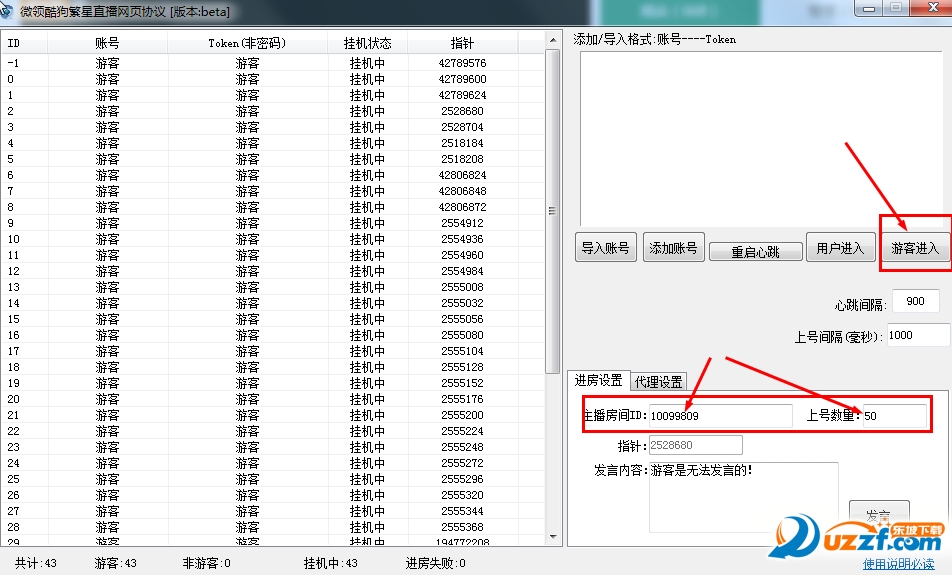 输入你想刷取协议人气的直播间的房间号,选择上号的数量!