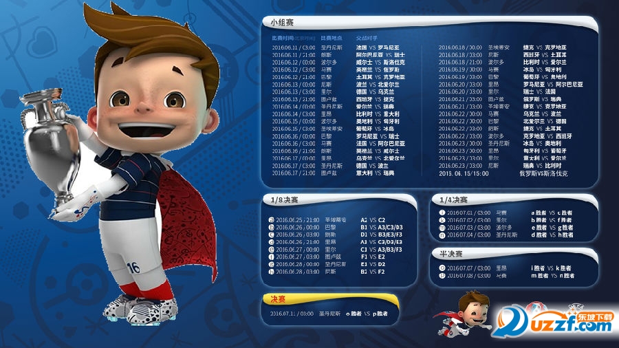 虽然2016年的欧洲杯已经开始了,但是有很多场次我们没有时间看,只能够根据这份2016欧洲杯赛程表墙纸捡重要的来看直播,其他的就只能够看重播了,高清无水印版的,你直接打印下来,贴在墙上或者桌子上都可以,还可以用做电脑或者手机的壁纸,可以提醒我们每场赛事的时间、地点、人物、球队等。