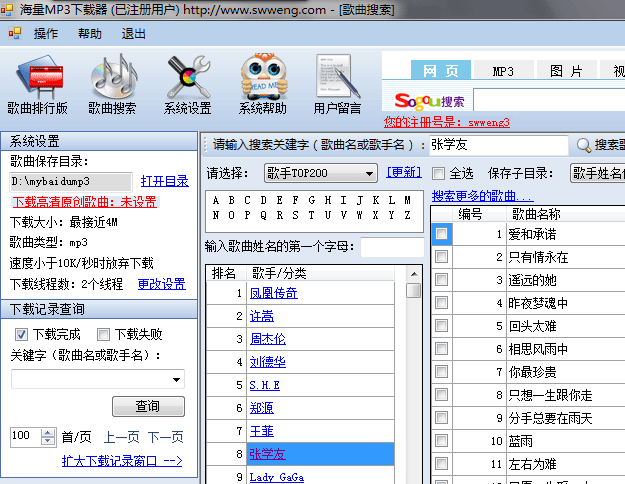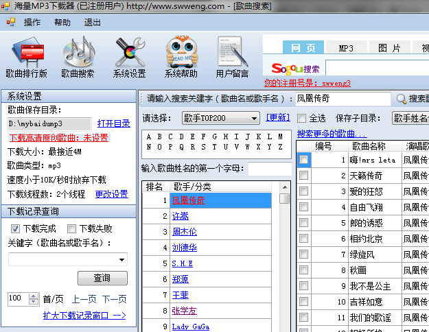 海量MP3下载器是一个批量下载音乐的绿色软件,使用多线程下载(线程数由用户自行设置),并可边下载,边搜索歌曲添加到下载列表中;自动将下载下来的歌曲重命名为“歌手名-歌曲名.*”,保存到您设定的目录中 ,排行版歌曲下载可将歌曲排名序号保存到文件名中,即“序号-歌手名-歌曲名.*”。 并可设置歌曲保存的子目录,方便歌曲的分类,可以以下面三种方式设置子目录:1、歌手姓名,2、排行版名称、3、用户自建。