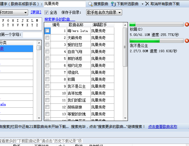 | 3、选中歌曲后,点击“下载所选歌曲”按钮,即开始下载,窗口右边出现下载进度条,“下载所选歌曲”旁边出现“取消所有歌曲下载”和“暂停下载”按钮,可以按此按钮对下载的歌曲进行控制。 |