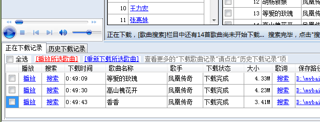 | 5、下载完毕后,点击"播放"按钮即可对你所下载的歌曲进行试听。 下载歌曲时,默认的是正在下载的记录。如果你想了解你以往的下载情况,请点击"历史下载记录"按钮。点击"历史下载记录"按钮后,你以前的下载记录将清晰的显示在下边.然后你可以选择你想要听的歌曲,点击"播放 所选歌曲"按钮,就可以对您选择的所有歌曲进行播放。同时,你也可以选择你不想保留在历史下载记录里的歌曲,然后点击"清除所选下载记录""清除文件不存在的下载记录"按钮,对你不想保留的歌曲进行删除。 |