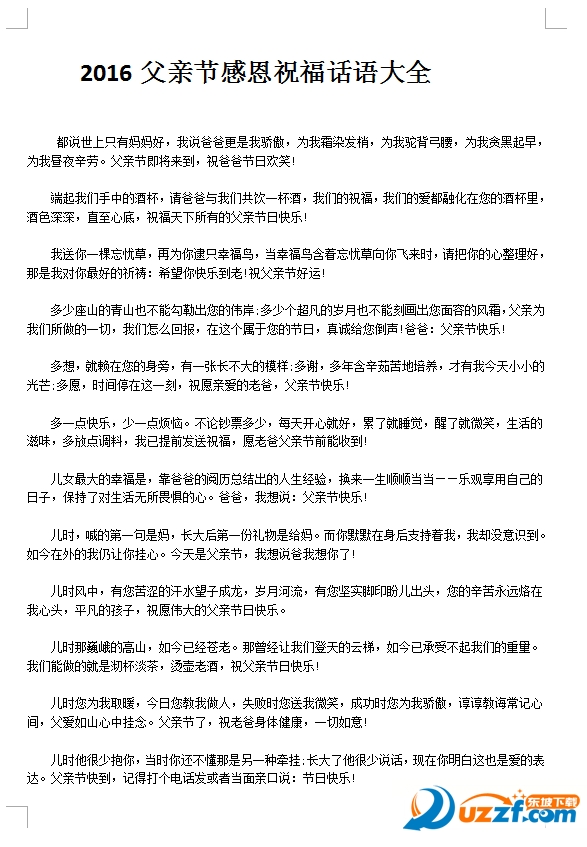2016年父亲节是哪一天?2016父亲节在6月19日农历五月十五这一天,有想送给父亲的祝福语吗?东坡小编精心整理了2016父亲节感恩祝福话语大全,都是一些简短的温馨祝福语,doc格式文档,可以编辑,需要的朋友可以免费下载。