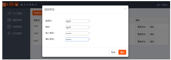 选择班级学生的列表按钮,在弹出的新增学生界面,点击新增学生按钮,在淡出添加学生界面输入登录名,昵称,输入密码和确认密码,点击提交完成学生添加。