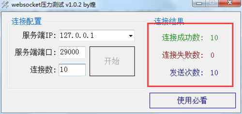 最后,点击开始。就可以看到右边的连接结果,显示连接成功的连接数是10个,发送消息的次数是10次。说明正常连接和发送。