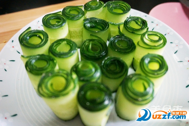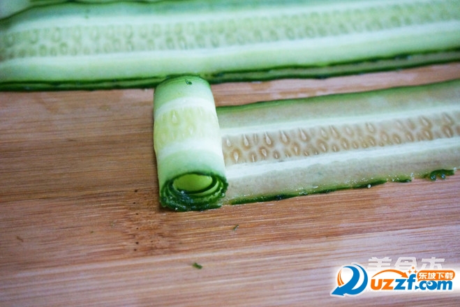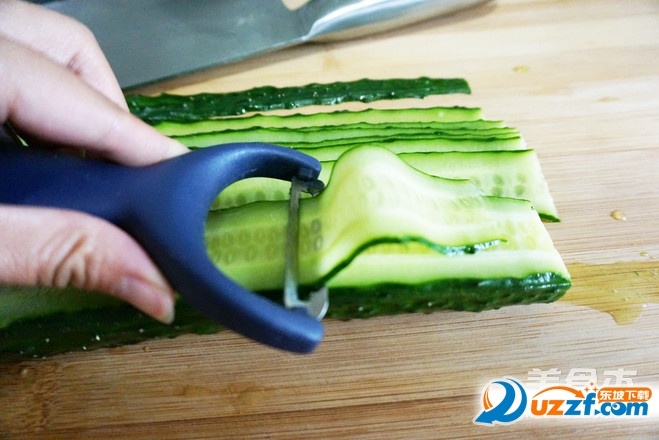 黄瓜洗净,用刮皮器刮成片状。