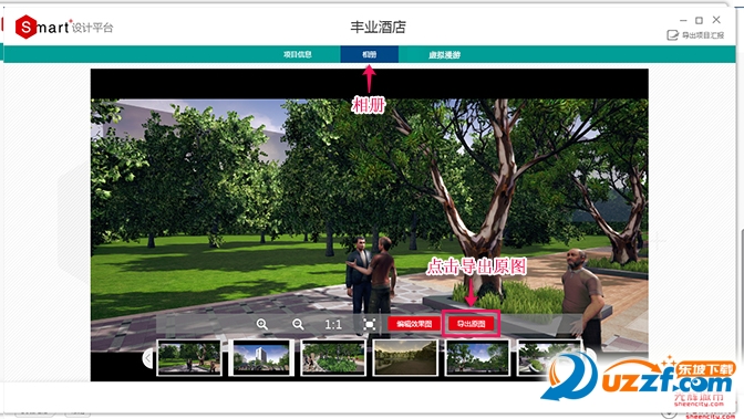 项目虚拟漫游生成后,用户可以在“相册”中使用虚拟漫游中【图标】拍照功能获取照片,如图4.3-1,虚拟漫游拍照的图片将直接显示在相册当中,用户根据需要选择导出原图或编辑效果图,并对照片进行排序、设为封面、删除等编辑操作;