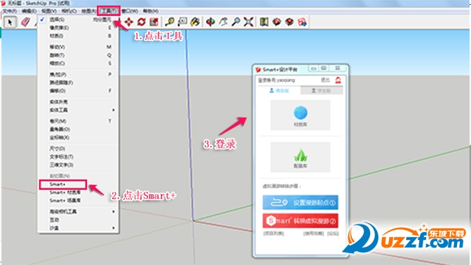 登录和使用Smart+ SU插件,打开进入SU,点击"工具",点击"Smart+ ",您只需要拥有Smart+平台账号,即可登录Smart+插件,进行模型上传,等待VR虚拟现实的转换制作。