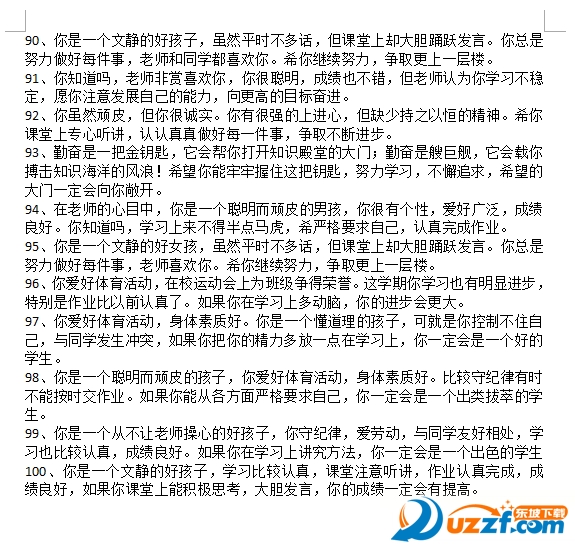 8、你知道吗,所有老师非赏喜欢你,不仅是因为你的成绩好,更重要的是你做任何事都认认真真,踏踏实实。这学期在学习上爱思考,能专研,愿你继续进取,成功一定属于你。