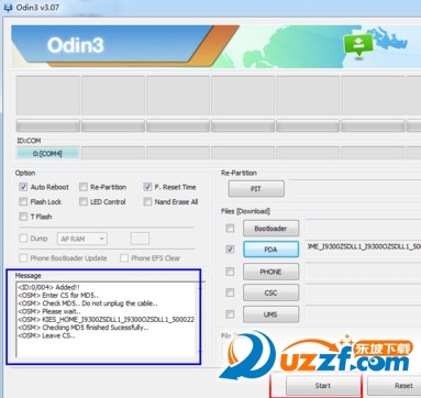 4、在Odin3点击pda选择你下载好的刷机包,这时候会卡一会,稍等出现蓝色框的文字,然后点击start开始刷机,刷机完毕后会自动重启