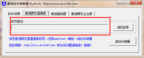 虽然这破解豪迪的多得是,但是这款软件绝对好用的要死你懂的,小白也会,先安装豪迪群发器,然后打开我们的破解补丁选择你安装的目录选择豪迪群发器的主程序想,选择好后点击启动并破解。ok了 普通群发、QQ登录、企业群发都可破解