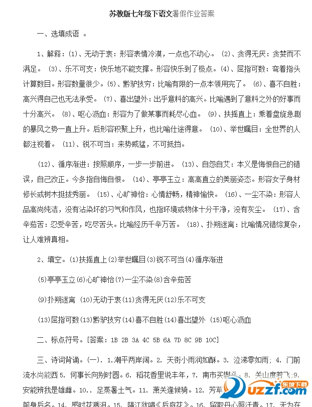 2016苏教版七年级暑假作业语文答案内容摘录